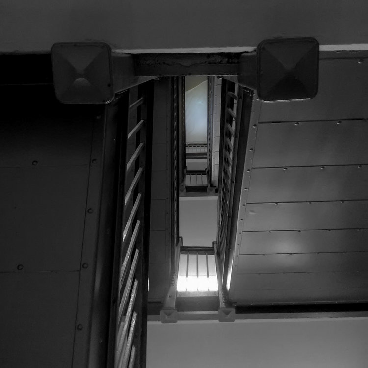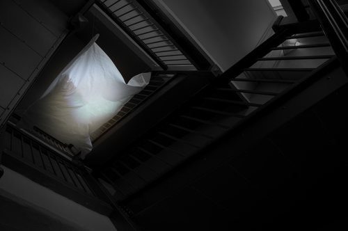 Snoring sounds fill the stairwell while a giant pillow with dreamy projections,